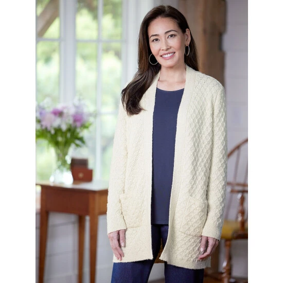 This three-season cardigan is knit in soft cotton with a stylish open-stitch diamond pattern. It’s the perfect midweight to keep you warm fall through spring. Finished with an open front, rib-knit detailing at the cuffs and hemline, and two patch pockets.