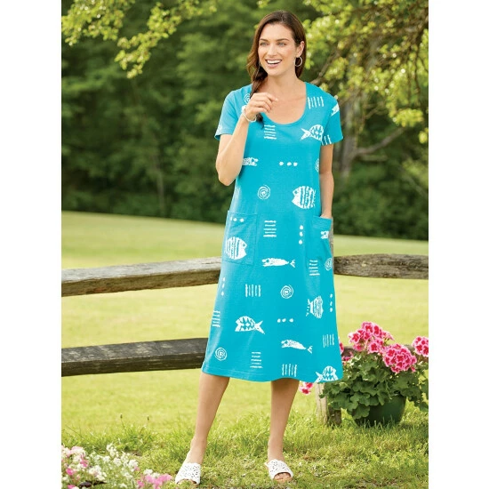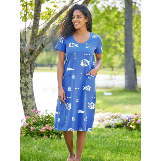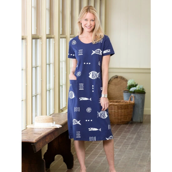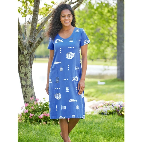 We gave the Rock Fish dress a sportier look with a shorter length and the addition of two cute patch pockets. The fit is relaxed and comfyand the iconic M.MACยฎ fish print is still the same tropical-inspired print our customers write rave reviews for. Only available here!