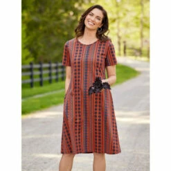 Cheapest โ๏ธ Vermont Country Store Vertical-Print Cotton Knit ๐ Dress Rust Multi ๐