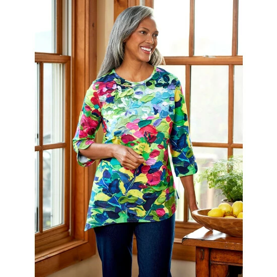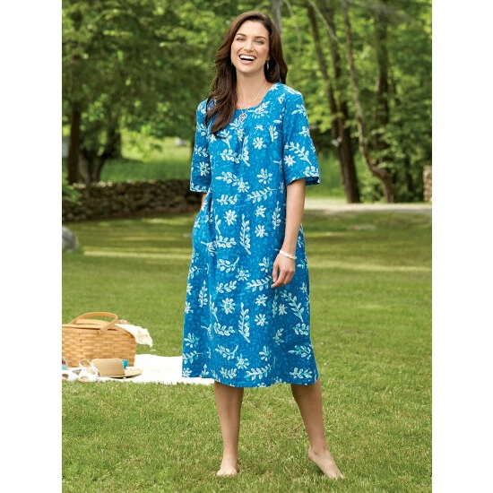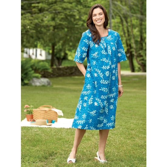As temperatures rise so does your need for no-fuss dressingβthatβs where this batik-print muumuu comes in. A perennial favorite with our customers, this muumuu’s unrestricting fit and all-cotton fabrication will help you keep cool and looking stylish, season-to-season. Features a square neck, gentle shirring across the front and back shoulder yoke, and side-seam pockets. Approx. 45″ long. Machine wash and dry. Imported. Available in both Missesβ and Women’s sizes.