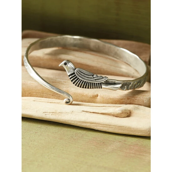 You might not guess that this silvery bracelet is a contemporary piece of jewelry. After all, there’s a vintage quality to the lovely bird itself, as well as the intricate floral scrollwork that makes up the engraved band. The adjustable bracelet is made from a rugged-but-bendable alloy of copper and zinc. (It’s a special combination that won’t tarnish!)