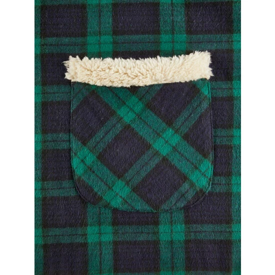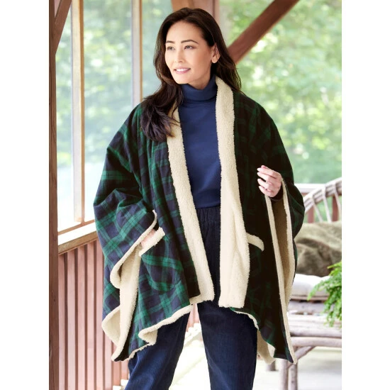 This soft, cozy cape features our signature flannel woven for us in Portugal and lined with plush fleece to keep you warm, whether snuggling on the couch or taking the dog for a walk. It has a cozy wrap style with handy side pockets trimmed in sherpa fleece for added warmth. Reversible for two looks!