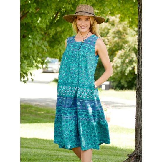 Keeping your cool this summer is a breeze in this lightweight sleeveless lounge dress. With gently gathered tiers for an unrestricted fit and an eyeful of style—this all-cotton dress is ideal for backyard barbecues, strolling in the park, or relaxing at home. Wear with a slip for full coverage.