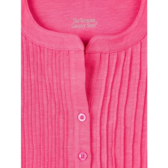 This tunic top drapes easily and has a touch of spandex, so it stretches to move with you. It’s the perfect weight for year-round wear and it offers nice coverage too. Other details include an A-line silhouette, drop yoke in the back with an inverted pleat, band collar with a notch neckline,3/4 sleeves, anddyed-to-match pearlized buttons.