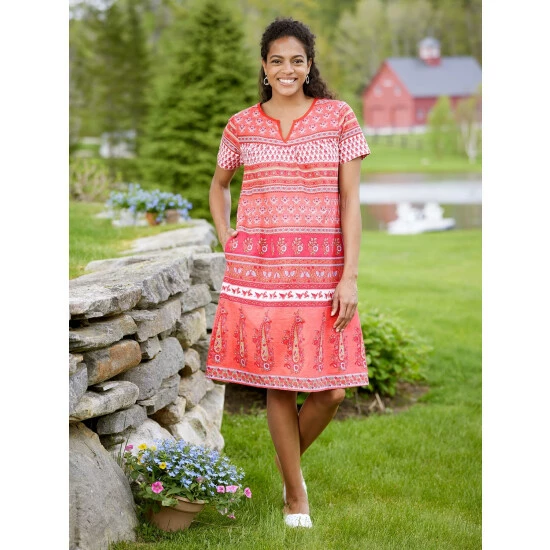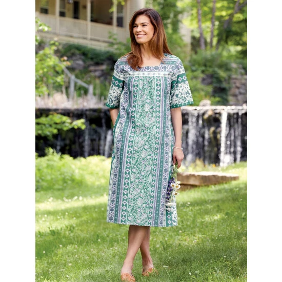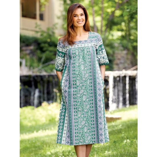 A unique colorful design gives this muumuu a fresh, updated look. It’s made from lightweight cotton with a generous fit and soft silhouette to keep you comfortable all day long. It finished with a flattering square neckline and gentle shirring along the drop yoke.