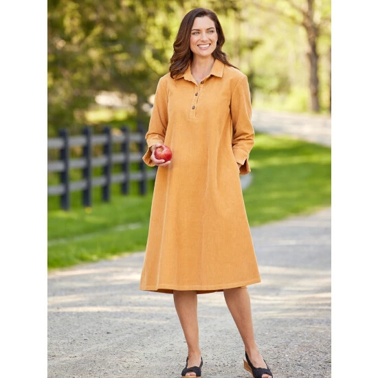 Fashioned from velvety cotton corduroy, this dress feels comfortably soft and warm with an A-line silhouette that flatters all shapes and sizes. The wide wale corduroy is extra plush and drapes beautifully and the dress is finished with a button-front placket, fashionable faux-horn buttons, 3/4 sleeves will roll-back notched cuffs, and side-seam pockets.