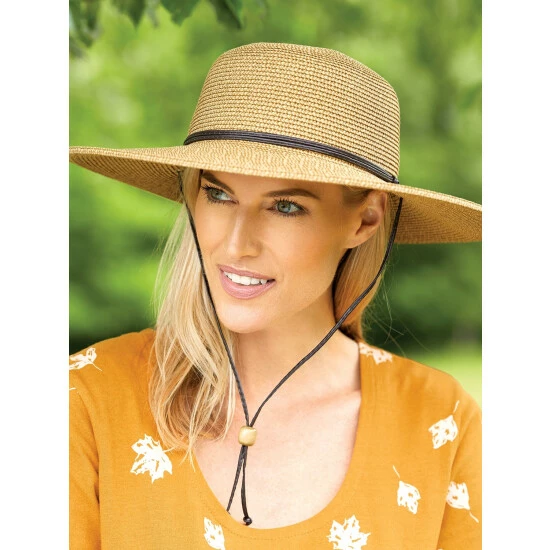This is the hat you need when you want protection from the sun and to look stylish while doing so! It’s soft and flexible, and tightly woven of a lightweight fiber that’s a blend of paper and polyester. It has a UPF of 50+ and is recommended by the Skin Cancer Foundation of America. It has a soft dome shape that flatters just about any face shape and a 3-1/2″ high crown with a generous 4″ wide brim. The faux leather hatband/chin cord adjusts, so you can be assured the hat won’t blow off in the breeze. A soft, polyester/cotton blend hatband absorbs perspiration and feels soft, not scratchy against your head.