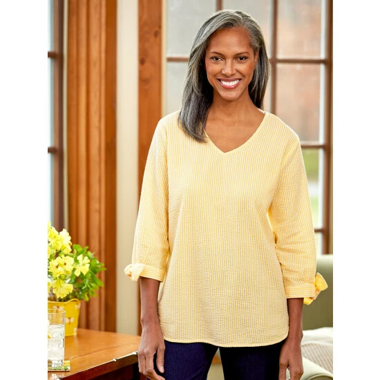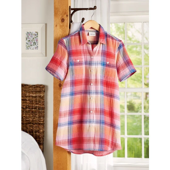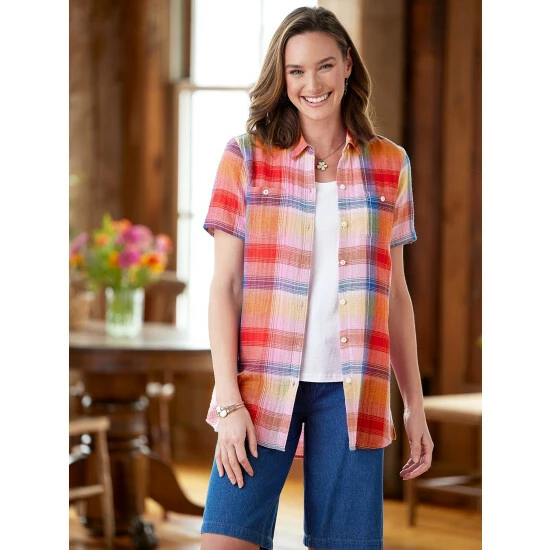 The great thing about gauze shirts is they are cool, lightweight, and airy. However, they tend to be see-through. Thatβs why we added two layers of gauze to this easy-wearing boyfriend shirt. It’s double-faced with a bright multicolor plaid on the outside and red and pink stripes on the inside so it keeps you covered and gets you noticed for all the right reasons. Features an inverted pleat in the back for greater freedom of movement and pearlized buttons along the button front and two chest pockets.