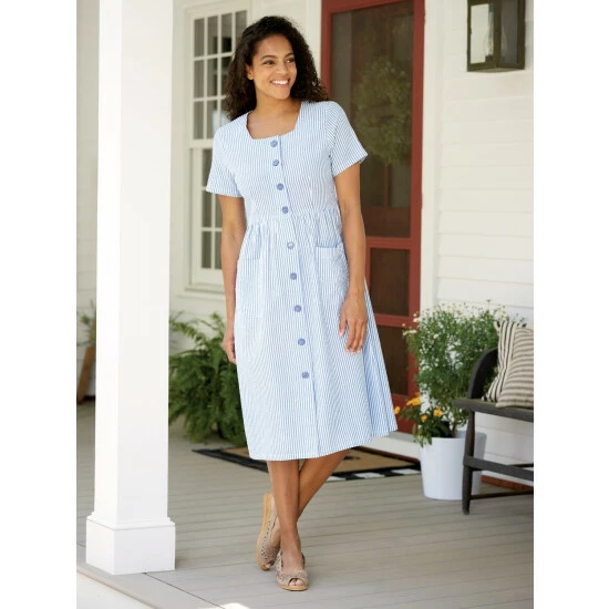 This sleeveless button-up top is a nice addition to your warm-weather wardrobe and looks pretty under a jacket or cardigan when the weather turns cool. Features coconut-shell buttons and a slightly curved hem. In easy-care crinkle cotton that always looks fun, fresh, and casual.