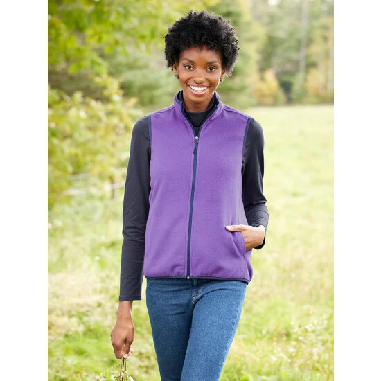 As the cold weather settles in, a midweight fleece vest like this becomes an indispensable part of your everyday wardrobe. You can wear it on its own or you can layer it under a coat. The premium fleece is made to resist pilling so the vest will look new for years to come. Other details include princess seams for added shaping, elasticized arm openings and hem to keep the cold out, a stand-up collar, and a full zippered front. It also has two handwarmer pockets with hidden zipper closures.