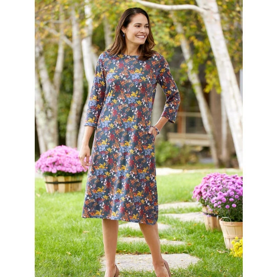 Whatever the season, you’ll be reminded of the beautiful fall foliage here in Vermont every time you slip on this colorful leaf-print dress. Itβs fashioned from soft jersey knit with an easy fit and is finished with 3/4 sleeves and a flattering scoop neckline. It also has a lined bodice to reduce see-through.