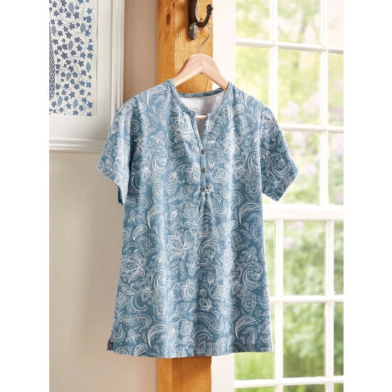 Though this paisley top looks brand new, when you slip it on, it will feel like an old favorite. Thatβs because the combed-cotton jersey knit is garment washed, which means any stiffness is washed away. Other details include a V-notch neckline, soft shaping at the waist, and a side-slit hem for added style.
