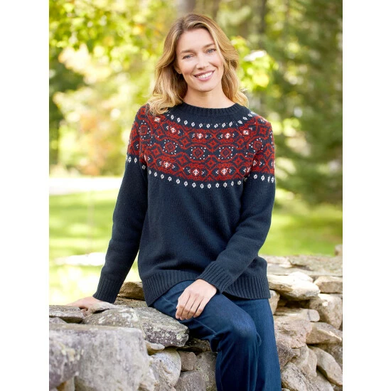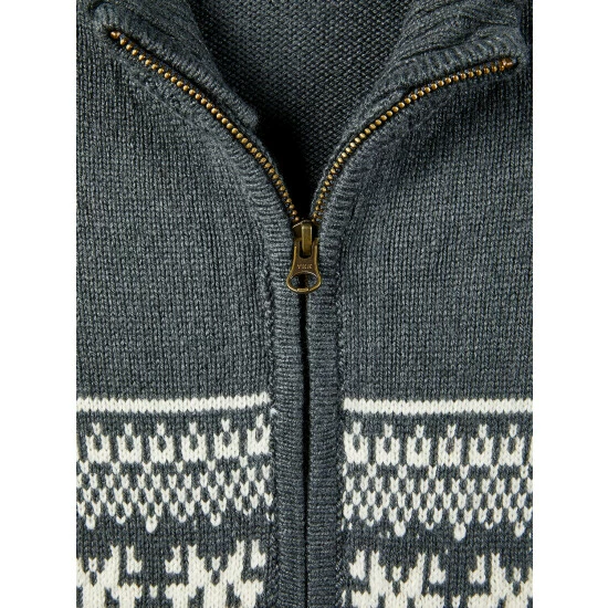 This classic sweater blends acrylic softness with the warmth of wool to keep you feeling cozy all season long. It has an all-around Nordic snowflake design that gives the cardigan a festive feel from every angle. Finished with a full zip front and rib-knit detailing along the stand-up collar, cuffs, and hem.